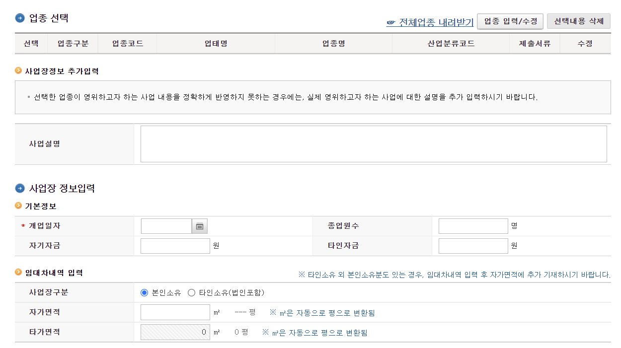 2. 기본정보를 작성한 후 업종 입력/수정을 클릭하여 업종코드와 업종을 기재 후 선택합니다.